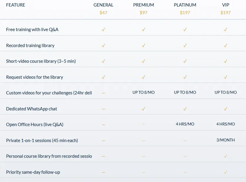 Choose the level of support that fits your business. Every tier includes access to training resources, and each step up adds more personalized, hands-on guidance from Dr. Terry Golightly.